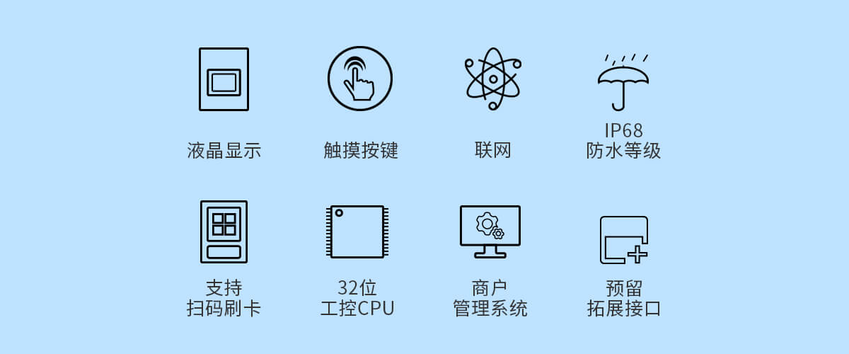 支持扫码消费,预充值,微信支付宝及时消费,支持云卡、储值卡消费;